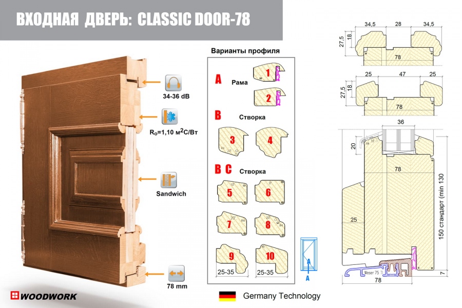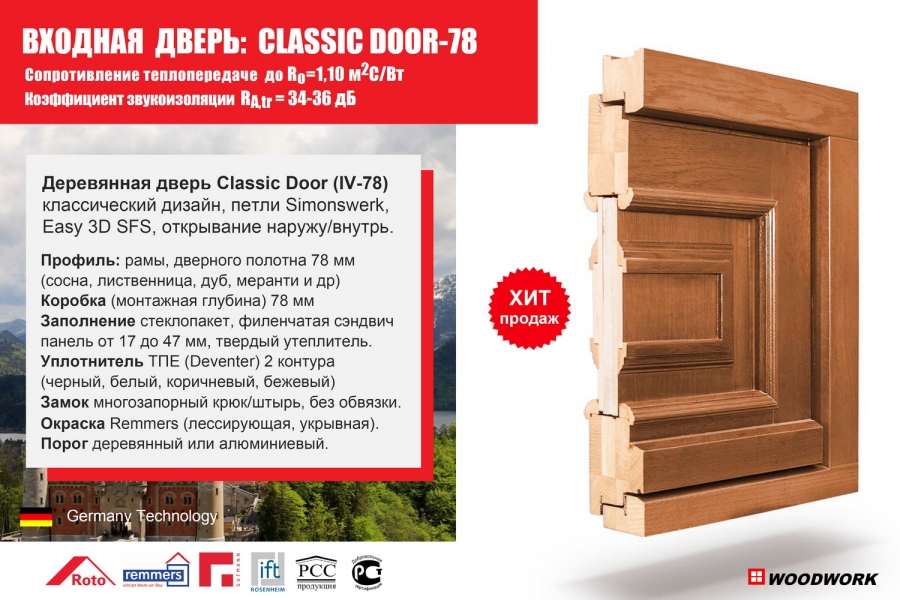 Серия «Classic Door» - модификация современной немецкой системы деревянных дверей IV-78 Hausturen, производятся по немецкой технологии с использованием лучших материалов и фурнитуры, на продукцию имеются российские сертификаты, декларации соответствия.
