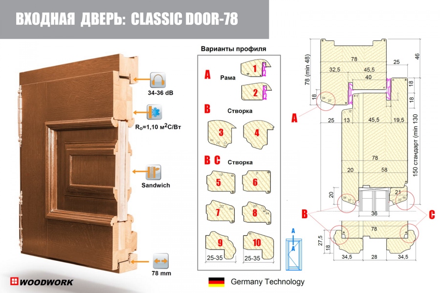 Профиль: 78х78 – 3 или 4-х слойный клееный брус (сосна, лиственница, дуб, меранти и др), система фиксации угловых клеевых соединений створки/коробки – деревянные шканты (бирони). Преимущества: максимальная герметичность и чистота обработки, крепление встык для врезных импостов, при соединении деталей под углом. Эстетический результат: лучшее соединение дверных элементов, без выхода шипа на поверхность изделия.