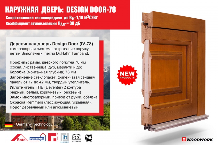 Серия «Design Door» - деревянная компланарная дверь открывающаяся наружу или внутрь, модификация немецкой системы IV-78 Hausturen, производятся по немецкой технологии с использованием лучших материалов и фурнитуры, на продукцию имеются российские сертификаты, декларации соответствия.