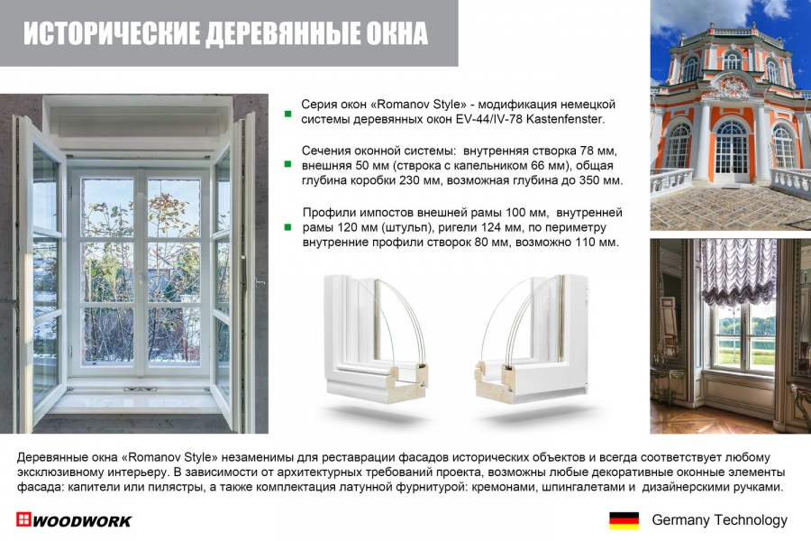 Используемые технические и конструкторские решения актуальны для реконструируемых или вновь строящихся исторических зданий, при необходимости возможны двухрамные классические окна с раздельным переплетом и фигурными декоративными шпросами. Долговечность деревянного окна из сибирской лиственницы достигает 50 и более лет.