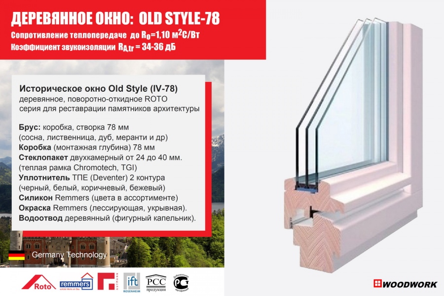 Серия «Old Style» - стилизацию современного окна под историческое деревянное окно: одностворчатое, открывающееся внутрь, с двойным или тройным стеклопакетом, изготавливается из 3-х или 4-х слойного клееного бруса толщиной 78х78 мм. Технология производства окон на базе современной немецкой системы IV-78 Holz Fenster.