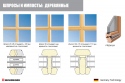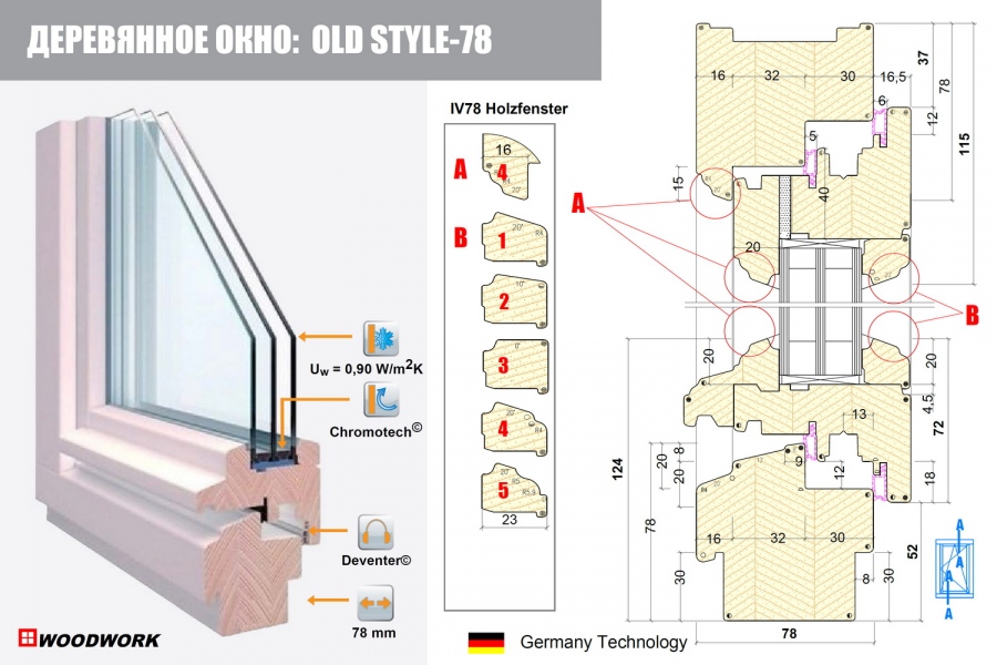 Профиль: 78х78 – 3 или 4-х слойный клееный брус (сосна, лиственница, дуб, меранти и др), система фиксации угловых клеевых соединений створки/коробки – деревянные шканты (бирони). Преимущества: максимальная герметичность и чистота обработки, крепление встык для врезных импостов, при соединении деталей под углом. Эстетический результат: лучшее соединение оконных элементов, без выхода шипа на поверхность изделия.