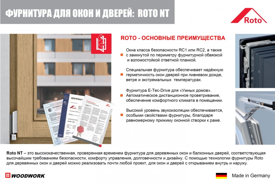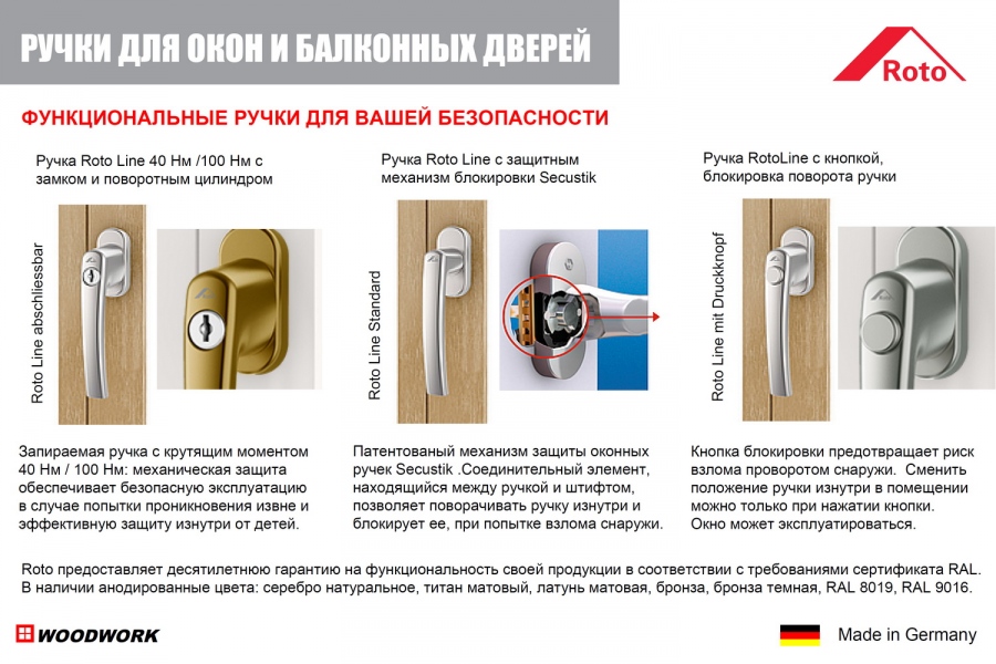 Фурнитура ROTO Frank (Германия) поворотная, поворотно-откидная, фальц окна шириной 30 мм (усиленная, противовзломная фурнитура), с режимом вентиляции микропроветривания, ручки ROTO и накладки на петли (цвет в ассортименте);