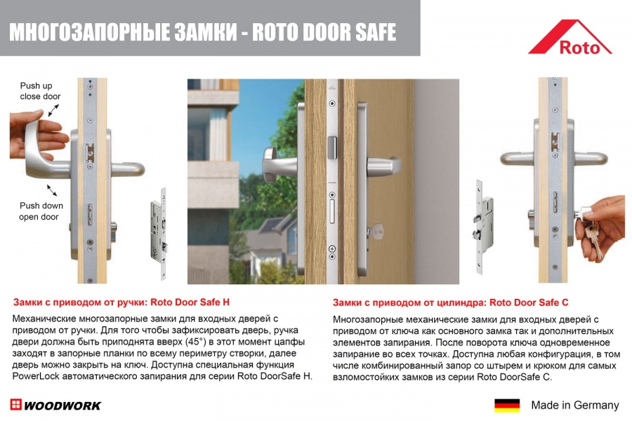 Roto DoorSafe - механические многозапорные замки для балконных дверей с приводом от ручки. Для того чтобы зафиксировать дверь, ручка двери должна быть приподнята вверх (45°) в этот момент цапфы заходят в запорные планки по всему периметру створки, далее дверь можно закрыть на ключ. Доступна специальная функция PowerLock автоматического запирания для серии Roto DoorSafe H 600
