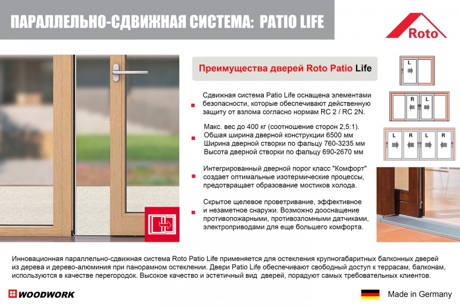 Roto DoorSafe - механические многозапорные замки для балконных дверей с приводом от ручки. Для того чтобы зафиксировать дверь, ручка двери должна быть приподнята вверх (45°) в этот момент цапфы заходят в запорные планки по всему периметру створки, далее дверь можно закрыть на ключ. Доступна специальная функция PowerLock автоматического запирания для серии Roto DoorSafe H 600.
