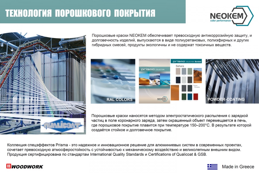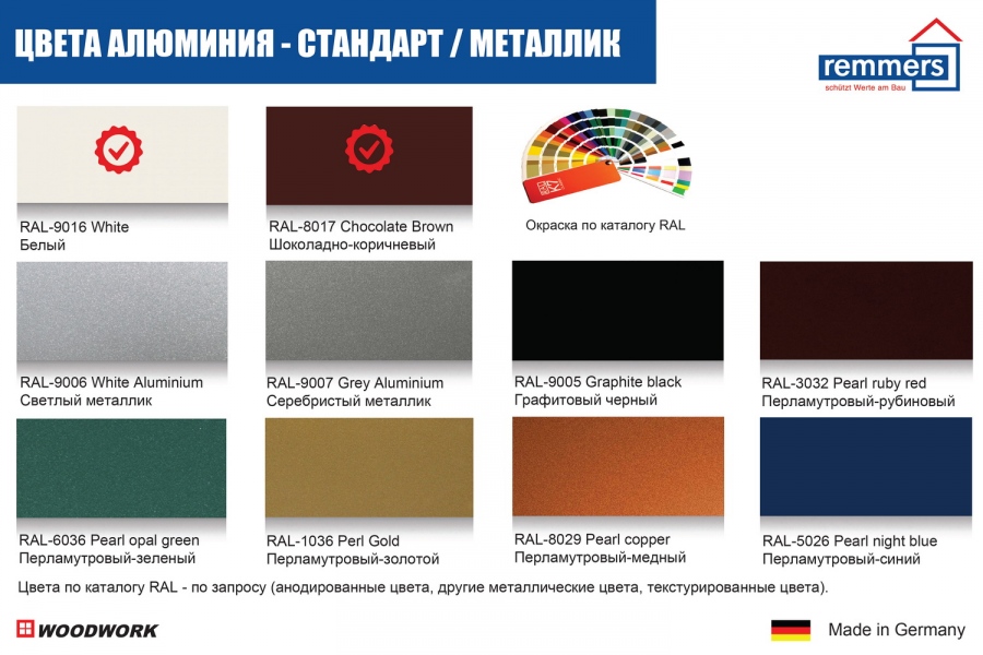 Порошковые краски Remmers применяются для окраски алюминиевых профилей дерево-алюминиевых окон и дверей, фасадных систем, обеспечивают оптимальную защиту. Порошковые краски наносятся методом электростатического распыления с зарядкой частиц в поле коронарного заряда, затем окрашенный объект перемещается в печь, где порошковое покрытие плавится при температуре 150–200°C. В результате которой создаётся стойкое и долговечное покрытие, отвечающее европейских нормам и стандартам качества ISO 9001 и ISO 14001.