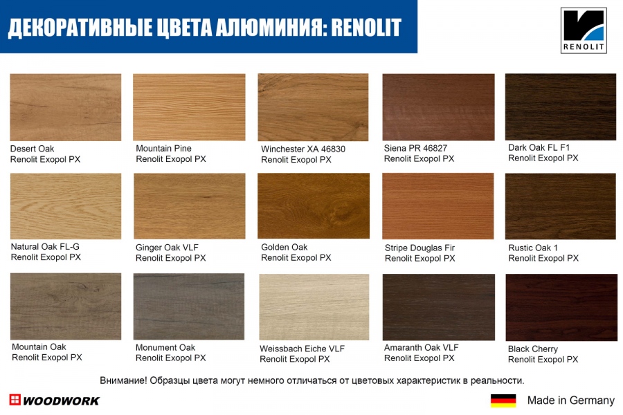 Вам предлагается широкая палитра как стандартных прозрачных цветов окраски окон из сосны и окон из дуба: 19 лессирующих (полупрозрачных) покрытий, а также 2 непрозрачных укрывных стандартных цвета (RAL-9016, 8017), или любой цвет по каталогу RAL. Возможен подбор цвета, патинирование, браширование, двух и трёхцветная отделка, отделка маслом и т.п. Для окраски алюминиевых поверхностей предлагаются стандартных цвета (RAL-9016, 8017), палитра цветов (глянцевые, матовые, металлик) по каталогу RAL. Возможна окраска алюминия под текстуру дерева.