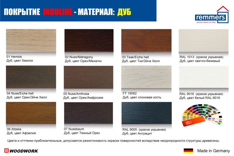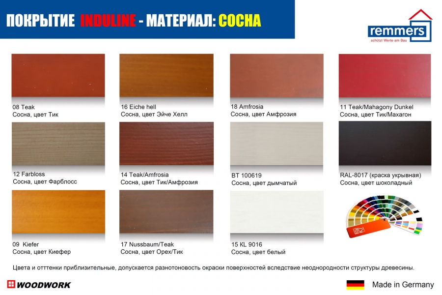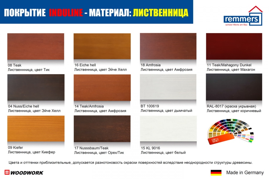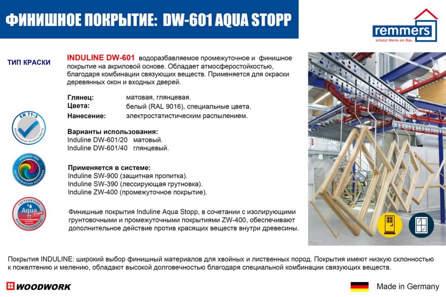Компания Remmers - мировый лидер области окраски дерева и дает 10-летнюю гарантию по всему миру: от холодного климата Финляндии до солнечного экстримального излучения в экваториальных зонах. Remmers разработал новой тип мультифазного полимера, который эффективно защищает от влаги и сохраняет эстетическое качество деревянных дверей или окон. Remmers полностью выполняет требования по качеству с сертификацией EN71/3 (отсутствие вредных элементов) и ЭКО-этикеткой Blue Angel.