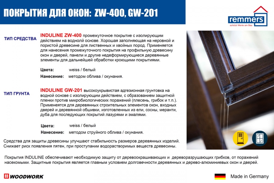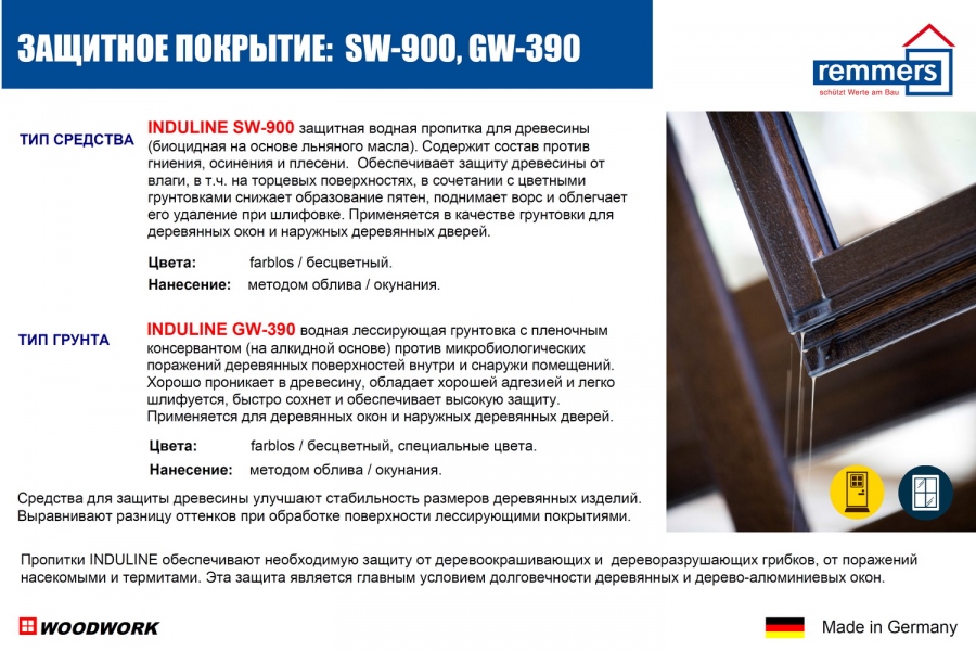 Пропитки INDULINE SW-900, GW-390, которые используются для окраски немецких деревянных окон, обеспечивают необходимую защиту от деревоокрашивающих и дереворазрушающих грибков, от поражений насекомыми и термитами. Эта защита является главным условием долговечности деревянных и дерево-алюминиевых окон. Средства для защиты древесины улучшают стабильность размеров деревянных изделий. Выравнивают разницу оттенков при обработке поверхности лессирующими покрытиями.