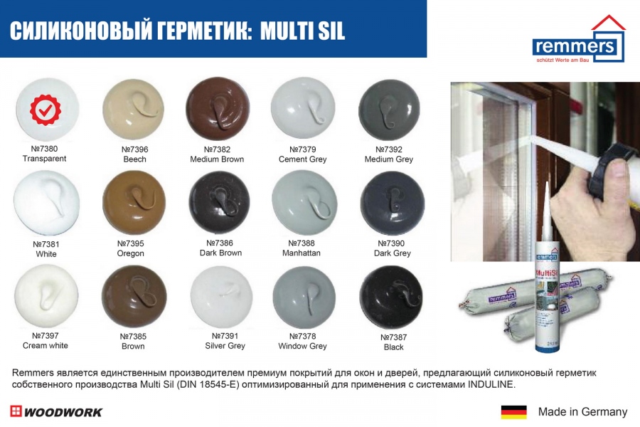 Силиконовый герметик Remmers MultiSil - это универсальный продукт, который используется при производстве оконных блоков, надолго защищает деревянные окна и двери от любых атмосферных воздействий. Касательно цветового оформления деревянных конструкций, вам предлагаются стандартные цвета (бесцветный) и широкая палитра из 15 цветов силиконового герметика (доп.наценка), отвечающая самым высоким требованиям к дизайну.
