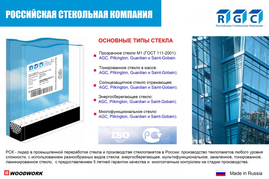 Российская стекольная компания сегодня предлагает стеклопакеты любого уровня сложности с использованием разнообразных видов стекла – однокамерные и двухкамерные, сложной геометрической формы, с расстекловкой, с закаленным, моллированным, энергосберегающим, ламинированным стеклом, с предоставлением многолетней гарантии качества и его многоэтапным контролем на стадии производства.
