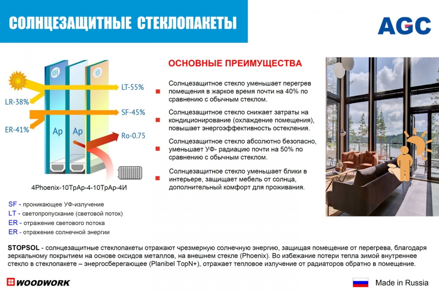 Многофункциональные стеклопакеты: отличные солнцезащитные характеристики при сохранении высокой степени прозрачности и светопропускания. Мультифункциональные селективные стекла нового поколения в составе стеклопакета имеют специальное покрытие из 7 невидимых глазу слоев оксидов металлов, способно выполнять одновременно солнцезащитные и теплоизолирующие функции. Экономия на отоплении зимой, на кондиционировании летом и непревзойденный комфорт на протяжении всего года.