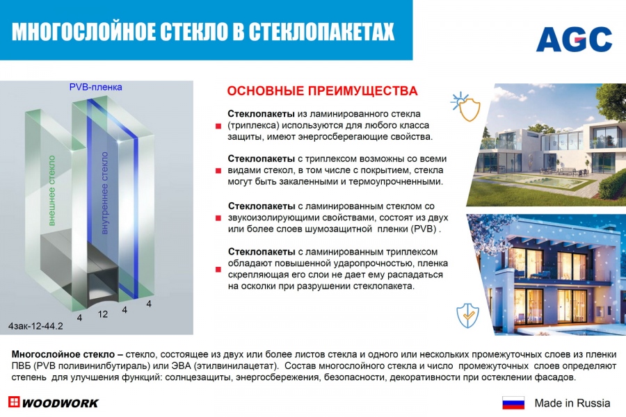 Ламинированное стекло: стеклопакеты из ламинированного стекла (триплекса) широко используется благодаря непревзойденным характеристикам по безопасности, звукоизоляционным свойствам, а также широким возможностям выбора цветовой палитры. Многослойное стекло – стекло, состоящее из двух или более листов стекла и одного или нескольких промежуточных слоев из пленки PVB (поливинилбутираль) или ЭВА (этилвинилацетат). Состав многослойного стекла и число промежуточных слоев определяют степень для улучшения функций: солнцезащиты, энергосбережения, безопасности, декоративности при остеклении фасадов, используются для любого класса защиты, имеют энергосберегающие свойства.