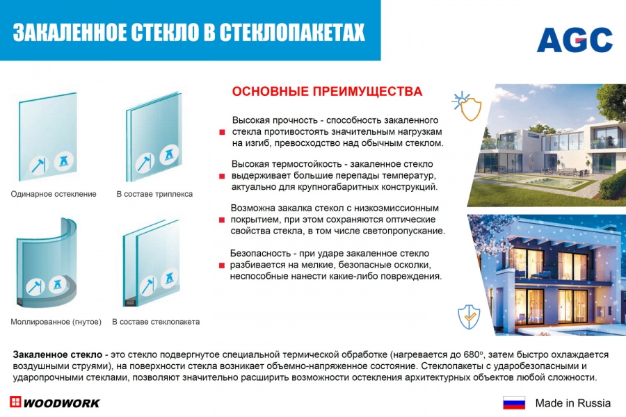 Закаленное стекло: стекло подвергнутое специальной термической обработке (нагревается до 650°- 680°, затем быстро охлаждается воздушными струями), на поверхности стекла возникает объемно-напряженное состояние. Возможна закалка стекол с низкоэмиссионным покрытием, при этом сохраняются оптические свойства стекла, в том числе светопропускание. Стеклопакеты с ударобезопасными и ударопрочными стеклами, позволяют значительно расширить возможности остекления архитектурных объектов любой сложности. Безопасность - при ударе закаленное стекло разбивается на мелкие, безопасные осколки, неспособные нанести какие-либо повреждения.