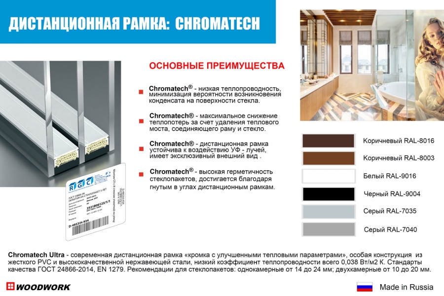 «Тёплая» дистанционная рамка из металла и пластика имеет самую низкую теплопроводность, благодаря чему предотвращает промерзание краевых зон стеклопакета и значительно снижает риск возникновения конденсата. Для еще большей теплоизоляции внутрь стеклопакета закачан инертный газ – аргон, замедляющий конвекцию воздуха внутри камеры стеклопакета и замедляющий процесс охлаждения камеры.