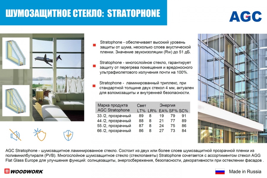 Шумозащитное стекло: ламинированное стекло Stratophone производства AGC. Состоит из двух или более слоев шумозащитной прозрачной пленки из поливинилбутираля (PVB). Многослойное шумозащитное стекло (стеклопакеты) Stratophone сочетается с ассортиментом стекол AGG Flat Glass Europe для улучшения функций: солнцезащиты, энергосбережения, безопасности, декоративности при остеклении фасадов. Значение звукоизоляции (Rw) до 51 дБ.