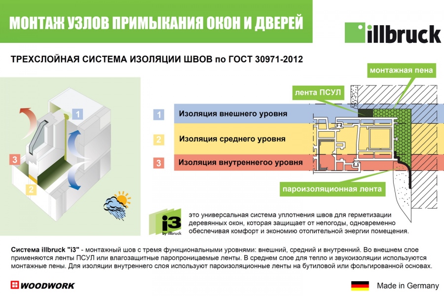 Монтажный шов illbruck “i3” имеет три функциональных уровня: внешний, средний и внутренний. Для изоляции шва в наружном слое применяются ленты ПСУЛ или влагозащитные мембраны. В среднем уровне для обеспечения тепло и звукоизоляции используются монтажные пены. Для изоляции внутреннего слоя используют пароизоляционные ленты на бутиловой или фольгированной основах или силиконовый герметик.