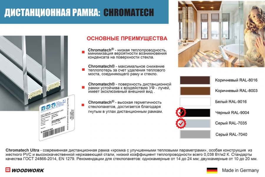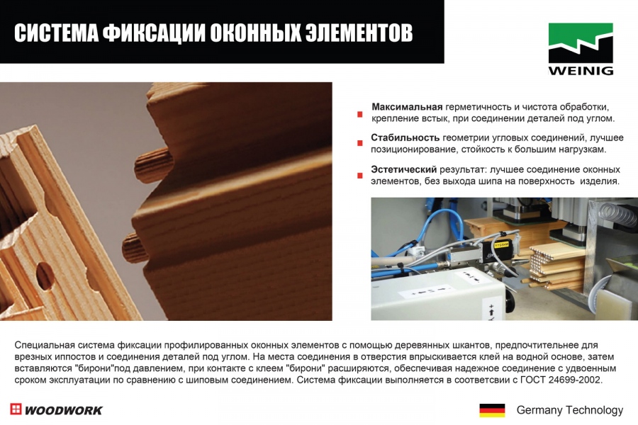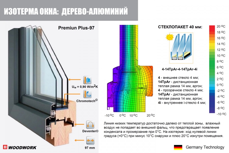 По сути, производство деревянных окон в России представляет из себя модификацию современной системы дерево-алюминиевых окон на основе немецкого стандарта IV-78 Holz-Alu Fenster (толщина деревянного профиля 78 мм). Алюминиевый оклад, поддерживающий стеклопакет с внешней стороны окна. Толщина изделия (коробки и створки) вместе с алюминиевыми накладками составляет 97,1 мм. Система оснащена 4-мя контурами уплотнения, включая уплотнитель на стыке дерево-дерево. Данная система позволяет оснащение стеклопакетом толщиной от 24 мм до 52 мм. Естественно, в данной системе возможна инсталляция в фасадное остекление (деревянное или дерево-алюминиевое).