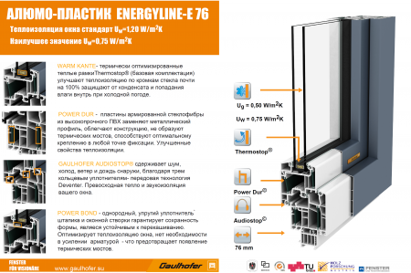 Ассортимент продукции Gaulhofer, построен по модульному принципу, поэтому вы легко найдете нужное окно, которое идеально будет соответствовать вашим потребностям. Алюмо-пластиковые окна Energyline имеют большее разнообразие для индивидуального дизайна: благодаря возможности использовать фурнитуру для наружного открывания окон и сдвижных дверей, а также окраску алюминия по каталогу RAL (несколько цветов под текстуру дерева).