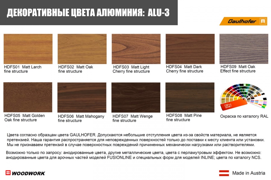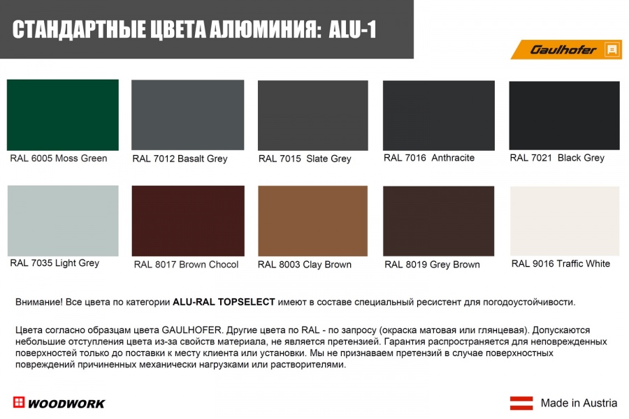 Для окраски алюминиевых поверхностей дерево-алюминиевых окон и дверей, предлагаются стандартные цвета (RAL-6005, RAL-7012, RAL-7015, RAL-7016, RAL-7021, RAL-7035, RAL-8003, RAL-8017, RAL 8019, RAL-9016).