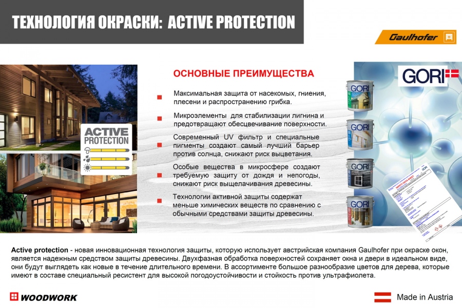 Active protection - новая инновационная технология защиты, которую использует австрийская компания Gaulhofer при окраске окон, является надежным средством защиты древесины. Двухфазная обработка поверхностей сохраняет окна и двери в идеальном виде, они будут выглядеть как новые в течение длительного времени. В ассортименте большое разнообразие цветов для дерева, которые имеют в составе специальный ресистент для высокой погодоустойчивости и стойкость против ультрафиолета.