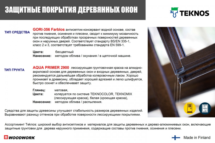 Защитные материалы GORI - водорастворимые антисептики и консерванты отлично защищают древесину от воздействия атмосферных явлений. Ассортимент грунтовочных и финишных материалов Teknos обеспечивают высокую укрывистость и максимальную глубину проникновения в окрашиваемую древесину, стойкость к воздействию ультрафиолетового излучения.