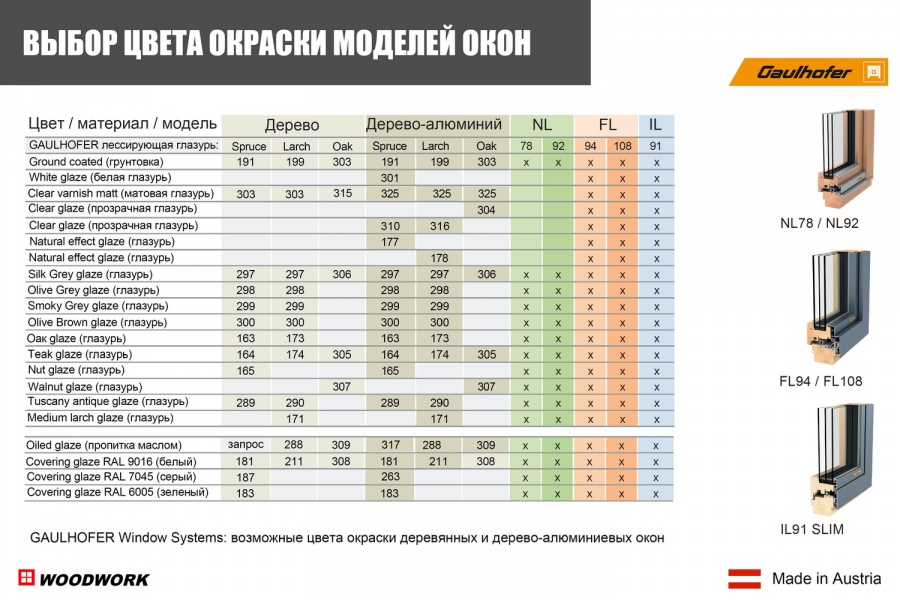 Большой выбор цветов окраски древесины, широкая палитра цветов для алюминия.