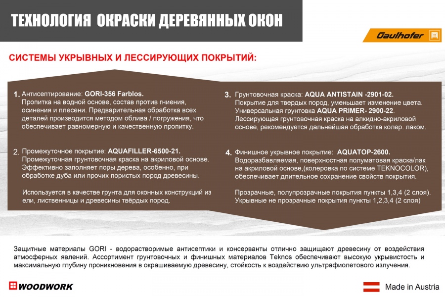 Благодаря специальному пропитывающему составу на основе природной смолы из лиственницы, который использует Гаульхофер - деревянные окна сохраняют идеальный вид после одного полного цикла специальной обработки деревянной поверхности окна без необходимости дополнительного покрытия впоследствии. Смола имеет все преимущества перед другими видами обработки изделий из дерева, кроме того, окраска дерева пропиткой позволяет выглядеть деревянному окну более естественно в его натуральном цвете, иметь естественный оттенок и структуру.