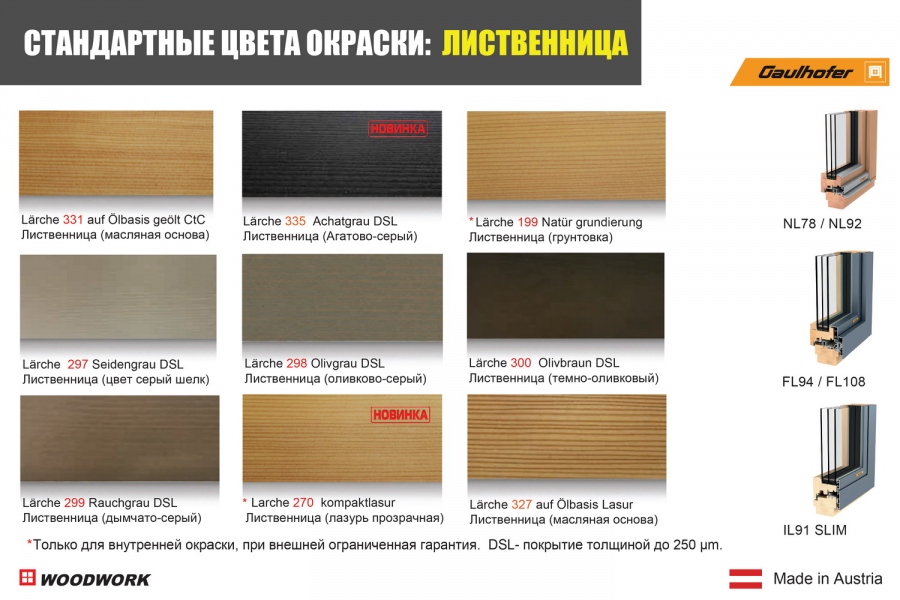 Гаульхофер разработал уникальный метод покрытия для окна из лиственницы: деликатная обработка древесины и результат - более выраженная структура поверхности деревянных окон вместе с улучшенной защитой. Специальное легкое покрытие деревянной поверхности придает индивидуальности окнам из лиственницы и ели, подчеркивает естественную красоту дуба, и всё это - без дополнительной платы!