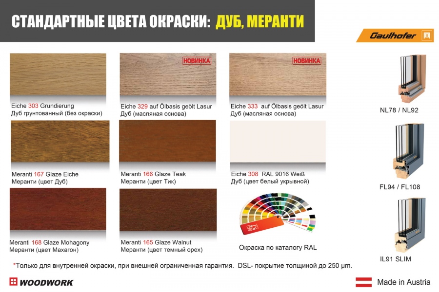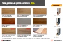 Вам предлагается широкая палитра как стандартных прозрачных цветов окраски окон из ели, окон из пихты, окон их лиственницы, окон из дуба и меранти: 20 лессирующих (полупрозрачных) покрытий, а также 3 непрозрачных укрывных стандартных цвета RAL-9016 (белый), RAL-7045 (cерый), RAL-6005 (зеленый), или любой цвет по каталогу RAL. Возможен подбор цвета по образцу заказчика, браширование, двухцветная отделка, обработка маслом и т.п.