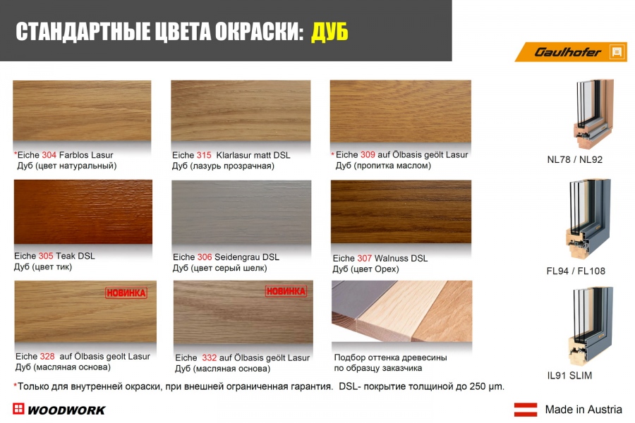 Обращаем внимание, что с 2021 г. предлагается новая категория декоративных цветов: браширование (искусственное состаривание), представляющее собой технологию механической обработки древесины путем снятия мягких волокон. Улучшаются эксплуатационные характеристики, древесина после обработки становится более прочной, устойчивой к воздействию влаги. Благодаря технологии структурирования и искусственного состаривания древесины окон и дверей, интерьер приобретает самобытность и уникальность.