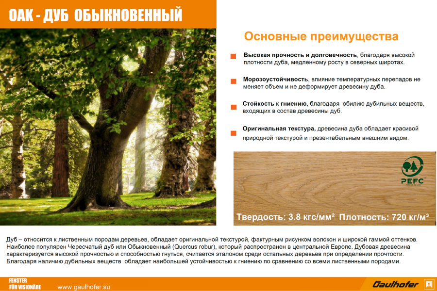 Дуб – относится к лиственным породам деревьев, обладает оригинальной текстурой, фактурным рисунком волокон и широкой гаммой оттенков. Наиболее популярен Чересчатый дуб или Обыкновенный (Quercus robur), который распространен в центральной Европе. Дубовая древесина характеризуется высокой прочностью, считается эталоном среди остальных деревьев при определении прочтости. Благодаря наличию дубильных веществ обладает наибольшей устойчивостью к гниению по сравнению со всеми лиственными породами.