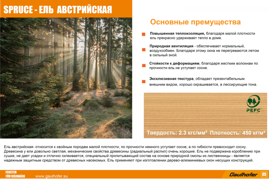 Ель - относится к хвойным породам малой плотности, по прочности несколько уступает сосне, однако по длительной стойкости к деформациям не уступает, а по гибкости превосходит сосну. Древесина у австрийской ели довольно светлая и мягкая, механические свойства древесины для такой малой плотности очень хорошие, поэтому ель используется в качестве строительной и конструкционной древесины.