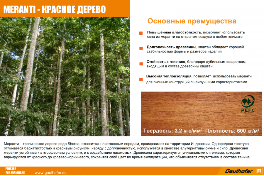 Меранти – тропическое дерево рода Shorea, относится к лиственным породам, произрастает на территории Малайзии, обладает долговечностью и устойчивостью к гниению и короблению. Древесина характеризуется уникальными оттенками, которые варьируются от красного до кроваво-коричневого, сохраняет свой цвет и не меняет его во время эксплуатации, что объясняется отсутствием в составе танина (галлодубильной кислоты). Древесина меранти устойчива не только к атмосферным условиям, но и к воздействию насекомых.