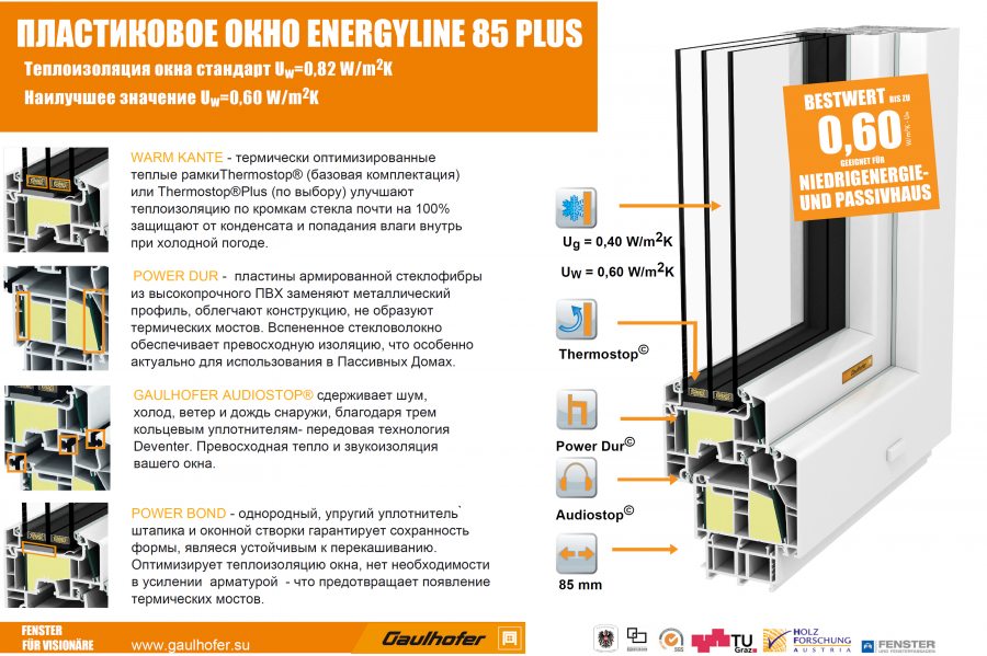 Пластиковые австрийские окна Energyline PLUS по своим теплоизоляционным свойствам соответствуют энергосберегающим требованиям и применяются при остеклении домов с низким энергопотреблением таких как Активный дом.