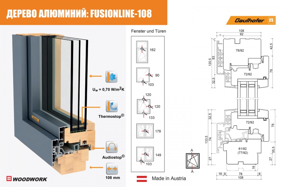 Дерево алюминиевые окна Fusionline 108 от Гаульхофер –это благородная комбинация дерева и алюминия. Деревянный профиль 92 мм с алюминиевой облицовкой окна надежно защищает от внешних погодных воздействий и обеспечивает естественную уютную атмосферу внутри помещения. Fusionline - лучшее решение для благоприятного климата вашего жилища! Дерево-алюминиевые окна Гаульхофер изготавливаются из австрийской ели и лиственницы, с многослойной окраской датскими лакокрасочными материалами GORI. Окна из австрийской ели оказались самыми востребованными, не только по своим теплосберегающим свойствам, но и лучшим статическим свойствам. Окна из лиственницы как самые влогостойкие обладают исключительно высокой плотностью, альпийская лиственница является самым износостойким хвойным деревом в Европе. Окна из меранти и дуба, как самые износостойкие и долговечные, обычно предпочитают устанавливать в жилые помещения, широкая палитра окраски создаст неповторимый интерьер. Широкая цветовая гамма по каталогу RAL (несколько цветов под текстуру дерева) преумножает возможные варианты окраски алюминия дерево алюминиевых окон Гаульхофер. Окна дерево алюминиевые Fusionline 108 от Гаульхофер- это самое надежное и теплое остекление на сегодняшний день в мире! Высокие теплофизические показатели дерево алюминиевого окна Uw =0,83 W/m2K обеспечиваются двухкамерным стеклопакетом с низкоэмиссионными стеклами, термически оптимизированными теплыми рамками внутри стеклопакета Thermostop Plus (Super Spacer), которые улучшают теплоизоляцию по кромкам стекла и предотвращают появление конденсата и попадания влаги внутрь при холодной погоде. Дерево алюминиевые окна Fusionline 108, используя авангардные разработки Гаульхофер, стали еще более востребованными для российских потребителей, преимущества отражены в невероятных величинах по теплоизоляции окон Uw =0,65 W/m2K с лучшими возможностями остекления.