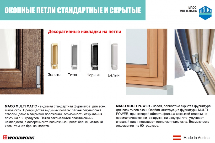 Премущества видимых петель: легкая регулировка створки, даже в закрытом положении, возможность открывания почти на 180 градусов. Петли закрываются декоративными пластиковыми накладками, в ассортименте несколько возможных цветов для стандартной петлевой группы: белые, матовый хром, темная бронза, коричневые, которые гармонично впишутся в любой интерьер.