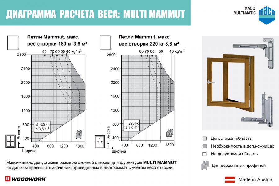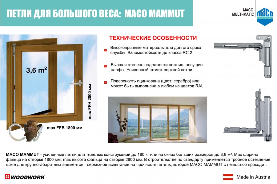 В объектном строительстве по стандарту применяется тройное остекление даже крупногабаритных элементов - серьезное испытание на прочность верхних и нижних петель: большая площадь, много стекла, большой вес. МАСО предлагает усиленные петли Mammut для тяжелых конструкций до 180 кг или на окнах больших размеров до 3,6 м². Max ширина фальца на створке 1800 мм, max высота фальца на створке 2800 мм. Даже несмотря на большой размер окон энергопотери должны быть сведены к минимуму. Поверхность петель видимая с оцинкованным или защитным покрытием - (по желанию клиента может быть выполнена в любом из цветов RAL, которые вписываются в любой интерьер).