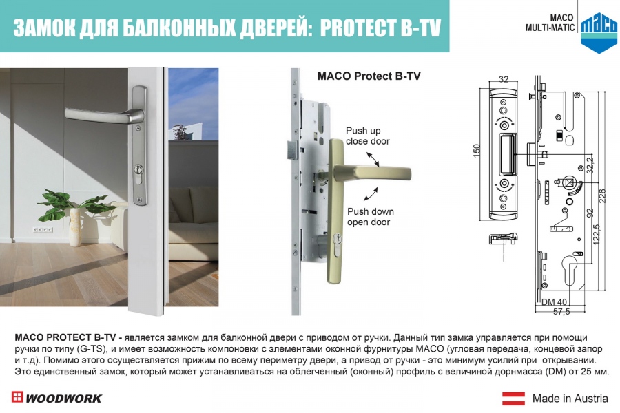 Для любых двустворчатых окон и балконных дверей рабочая створка оснащается оконной ручкой или дверной ручкой с замком, для пассивной створки применяется скрытая ручка штульпового механизма. Многозапортный замок МАСО Protect B-TV- это единственный замок, который может устанавливаться на оконных профилях. Для того чтобы зафиксировать дверь, ручка двери должна быть приподнята вверх (45°) в этот момент цапфы заходят в запорные планки по всему периметру створки, далее дверь можно закрыть на ключ. Данный тип замка имеет возможность компановки с элементами оконной фурнитуры МАСО. Помимо этого осуществляется прижим по всему периметру двери, а привод от ручки - это минимум усилий при открывании.