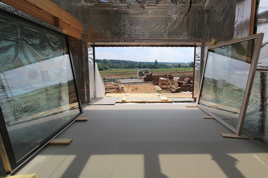 Выход во внутренний двор оснащен наклонно-раздвижными дверьми (PSK), оснащены специальной противовзломной фурнитурой МАСО. Панорамные окна на главном фасаде имеют ширину 4800 мм и высоту 2600 мм (не открывающиеся створки размером 2400*2600 мм, площадь более 6 кв.м. использовались стекла толщиной 6 мм). Фасадные окна оснащены откидными створками на электро-приводе (интегрированны в общую систему Умного дома).
