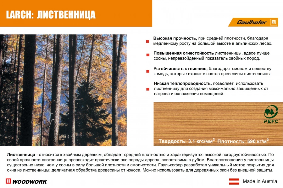 Лиственница - относится к хвойным деревьям, обладает средней плотности и характеризуется исключительно высокой погодоустойчивостью, является самым износостойким хвойным деревом в Европе. По своей прочности древесина лиственницы превосходит практически все породы дерева и сопоставима с дубом. При использовании защитных покрытий лиственница практически не меняют влажности, можно использовать для деревянных окон без внешней алюминиевой защиты.
