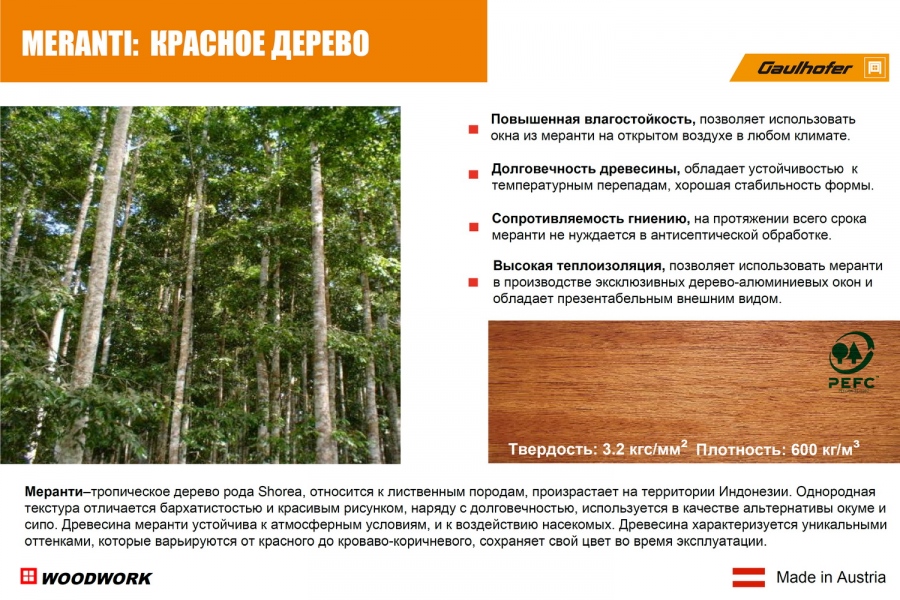 Меранти – тропическое дерево рода Shorea, относится к лиственным породам, произрастает на территории Малайзии, обладает долговечностью и устойчивостью к гниению и короблению. Древесина характеризуется уникальными оттенками, которые варьируются от красного до кроваво-коричневого, сохраняет свой цвет и не меняет его во время эксплуатации, что объясняется отсутствием в составе танина (галлодубильной кислоты). Древесина меранти устойчива не только к атмосферным условиям, но и к воздействию насекомых.