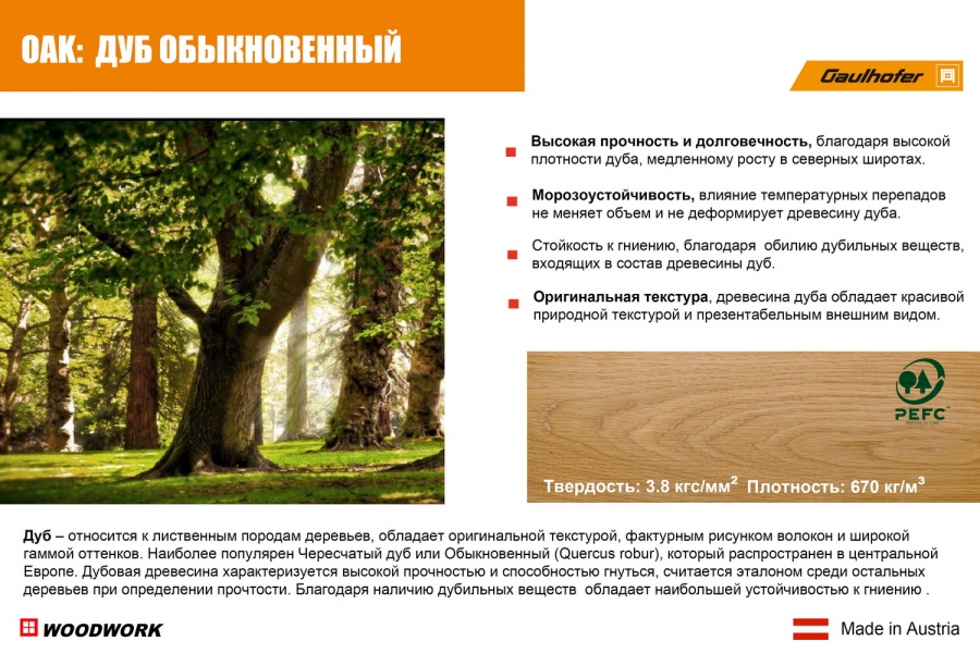 Дуб – относится к лиственным породам деревьев, обладает оригинальной текстурой, фактурным рисунком волокон и широкой гаммой оттенков. Наиболее популярен Чересчатый дуб или Обыкновенный (Quercus robur), который распространен в центральной Европе. Дубовая древесина характеризуется высокой прочностью, считается эталоном среди остальных деревьев при определении прочтости. Благодаря наличию дубильных веществ обладает наибольшей устойчивостью к гниению по сравнению со всеми лиственными породами.
