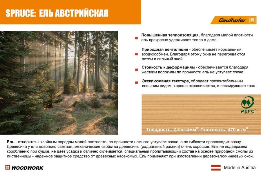 Для австрийских деревянных окон используется натуральная, экологически чистая древесина, из альпийских лесов, только лиственница и ель.