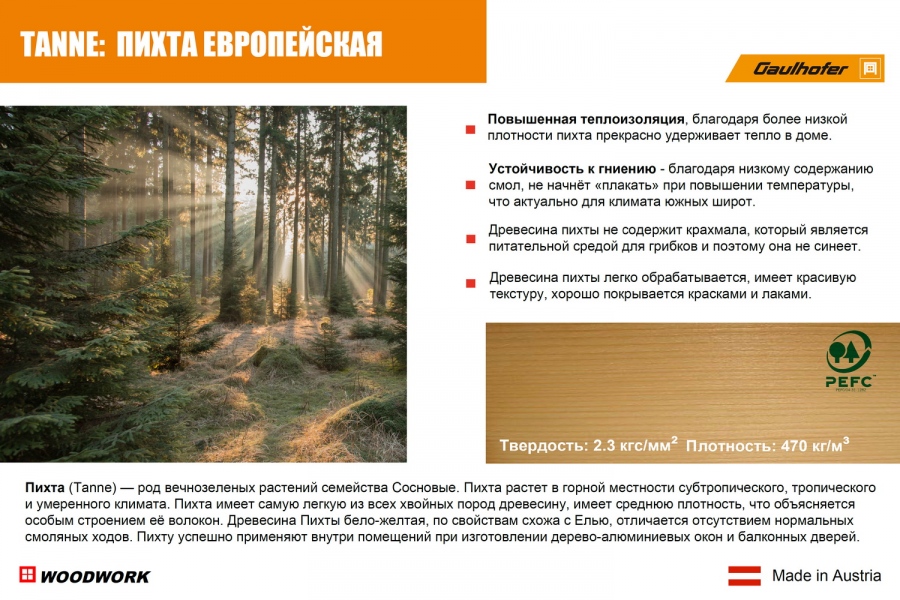 Пихта - относится к хвойным породам малой плотности, по прочности несколько уступает ели и сосне, Пихта имеет самую легкую из всех хвойных пород древесину, имеет среднюю плотность, что объясняется особым строением её волокон. Древесина Пихты бело-желтая, по свойствам схожа с Елью, отличается отсутствием нормальных смоляных ходов. Пихту успешно применяют внутри помещений при изготовлении дерево-алюминиевых окон и балконных дверей.