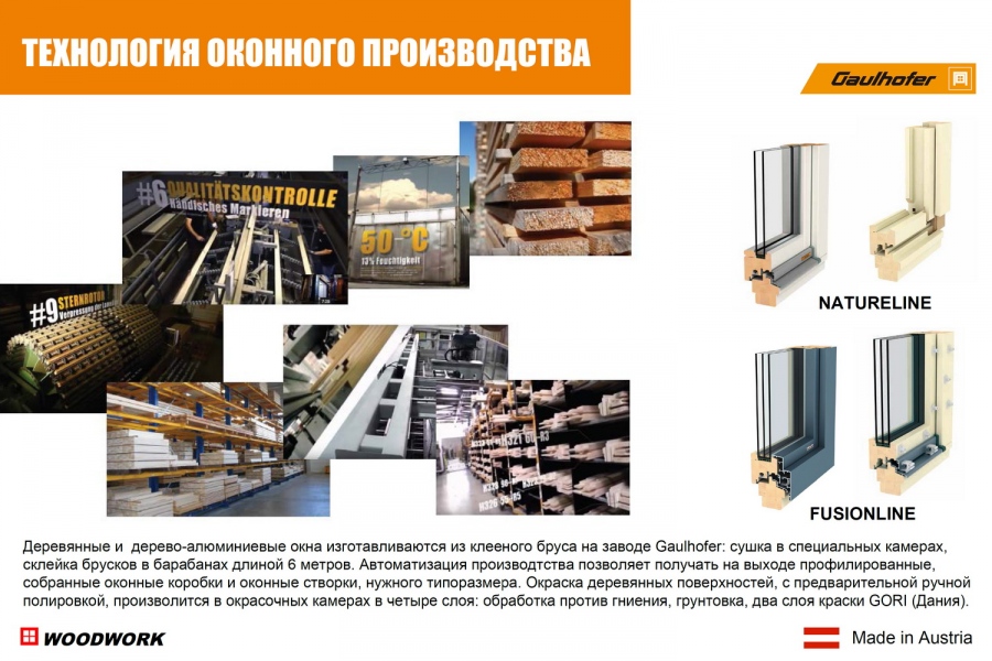 Начиная с изготовления основных деревянных профилей, всем производственным процессом деревянных изделий занимается компания Гаульхофер, это единственный способ гарантировать высокий уровень качества, на который мы претендуем.