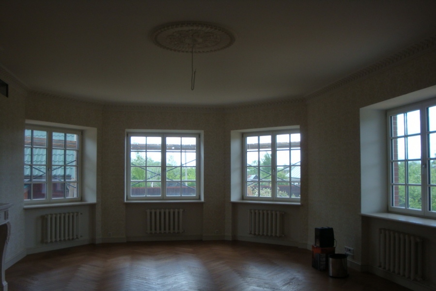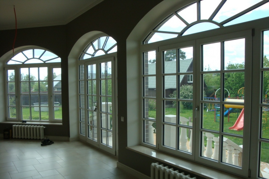 В проекте использованы деревянные окна Natureline-70 из клееной лиственница, глубина оконного профиля 70 мм, три контура уплотнения, двухкамерный теплоизолирующий стеклопакет (Termostop), c теплой межстекольной рамкой (Chromotech, цвет черный), обеспечивает надежную теплоизоляцию окна Uw=0,9 W/m2K. Использование окон Gaulhofer с декоративными раскладками на стеклопакете 30 мм изнутри и снаружи, окраска в белый цвет подчеркивают классический стиль дома.