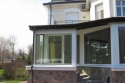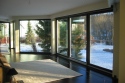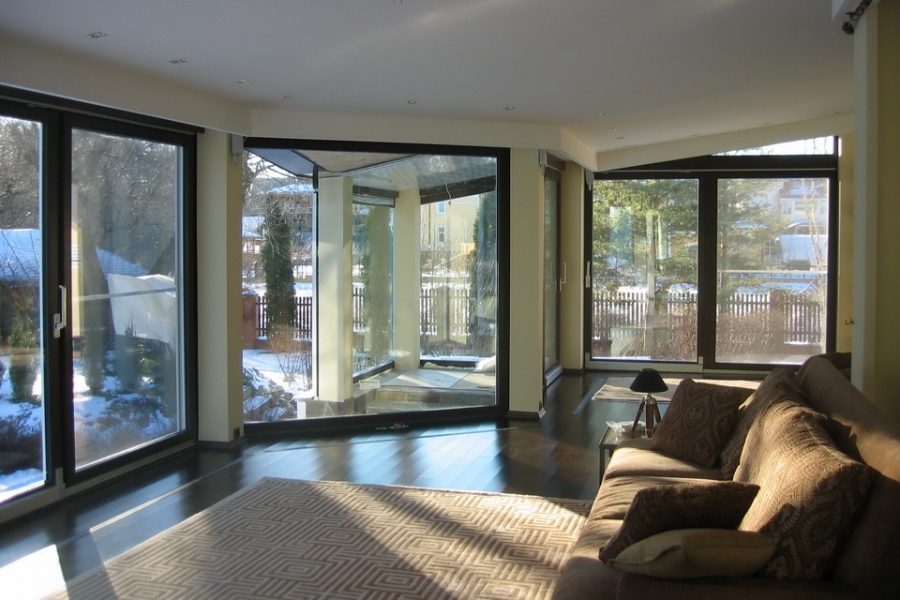 Австрийские дерево-алюминиевые окна Fusionline-86 из лиственницы (цвет темный орех), глубина коробки 69 мм (профиль 86 мм), три контура уплотнения, двухкамерный теплоизолирующий стеклопакет (Termostop), позволили создать теплую и комфортную всесезонную веранду, коэффициент теплоизоляции окон и дверей Uw=0,9 W/m2K.