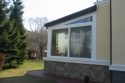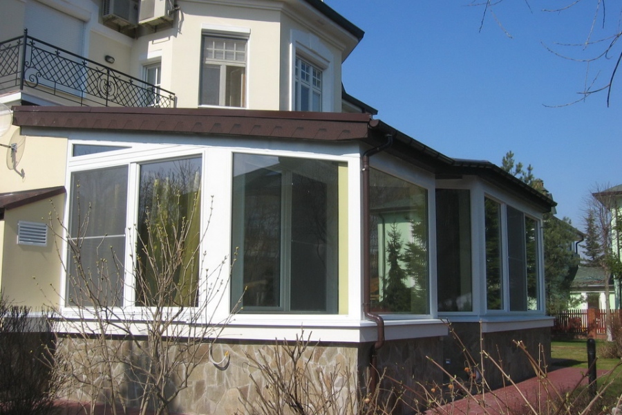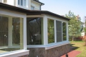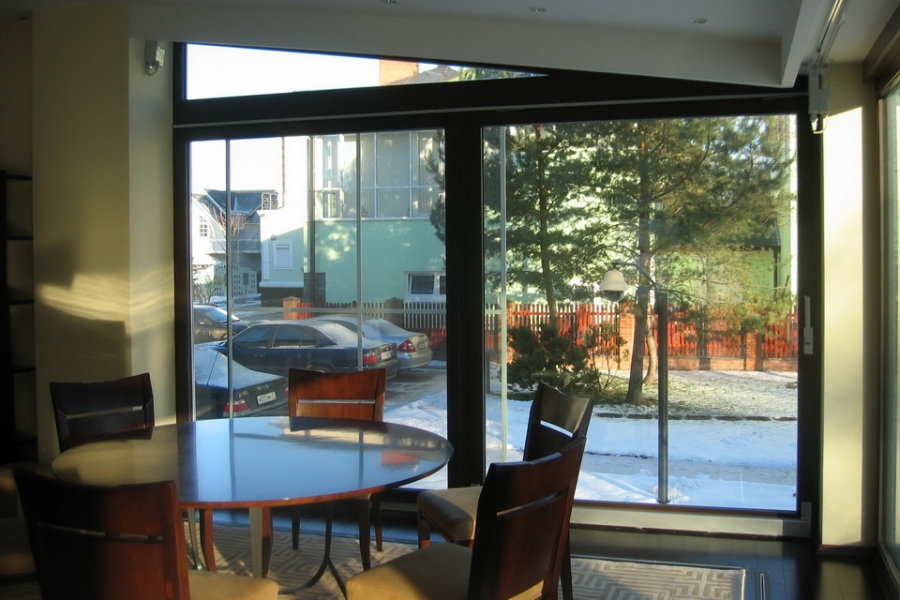 При остекление веранды использовались параллельно-раздвижные двери и глухие неоткрывающиеся витринные окна размеро 2600*2500 (h). Ширина раздвижных трехстворчатых дверей в центральной части доходит до 5000 мм. Металлические вертикальные утепленные колонны закрыты с внешней стороны дерево-алюминиевыми доборами, с углами поворотов 90 градусов и 135 градусов, при этом создается замкнутый тепловой контур по периметру всей веранды, включая созданную зону крыльца. Раздвижная дверь выполняет роль входной двери с замком повышенной секретности.