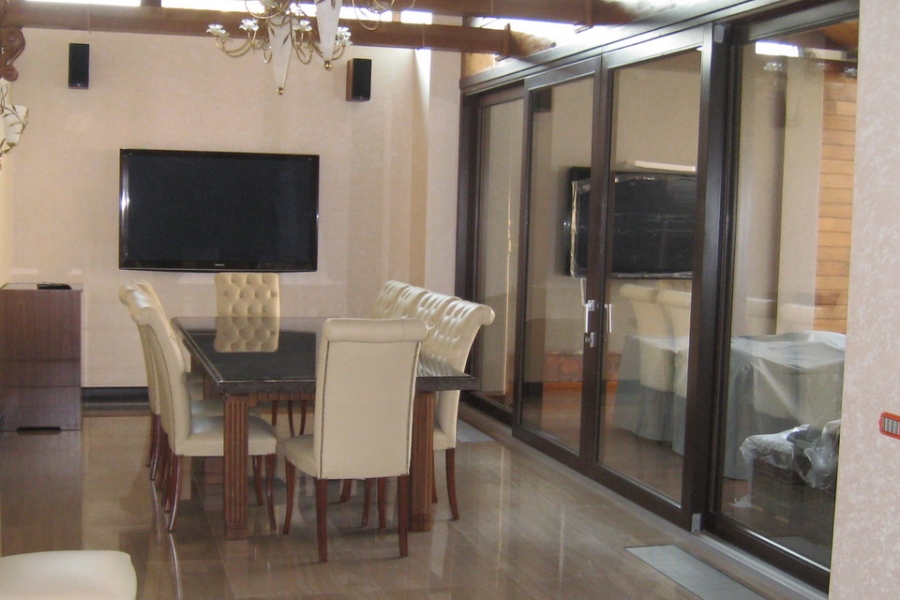 Остекление осуществлялась дерево алюминиевыми окнами модели Fusionline-86, материал древесины меранти (Индонезия), глубина деревянного профиля 69 мм, с двухкамерным теплоизолирующим стеклопакетом (Termostop), c теплой межстекольной рамкой (Chromotech, цвет черный), коэффициент теплоизоляции окна Uw=0,9 W/m2K, обеспечивает надежную систему по сохранению тепла всего дома.